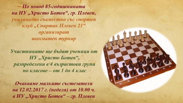 По повод 85-годишнината на Начално училище „Христо Ботев“ в Плевен, съвместно със Спортен клуб „Спартак Плевен XXI“, ще бъде организиран шахматен турнир, съобщиха от клуба. Участниците ще бъдат ученици от НУ „Христо Ботев“, разпределени в 4...