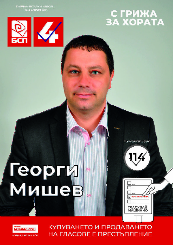Георги Мишев е кандидат за народен представител от листата на „БСП за България“ в Първи Многомандатен избирателен район – Благоевград. Роден е в град Гоце Делчев през 1980 г. Завършил е висше образование в ЮЗУ ”Неофит Рилски” гр. Благоевград със специалност “Българска народна хореография”. Работи като секретар на Народно читалище “Просвета – 1865” гр. Гоце…