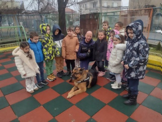 Ст. полицай Радослав Златков от ОДМВР и четириногият му колега Виктор гостуваха в детска градина „Май“ в Кюстендил