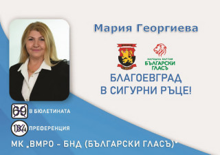Четвърта в листата с кандидати за общински съветници от МК "ВМРО - БНД (БЪЛГАРСКИ ГЛАСЪ) " е адвокат МАРИЯ ГЕОРГИЕВА - юрист с дългогодишна практика, със солиден административен и управленски опит. Мария Георгиева е председател на Адвокатски Съвет към Адвокатска Колегия - Благоевград. Основател и ръководител на "Център за безплатно правно консултиране" на лица в неравностойно положение. Мария Георгиева се включва в предизборната надпревара с амбицията да търси...