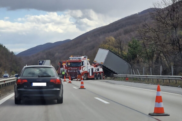 Движението по АМ „Тракия“ е затруднено за катастрофирал тир