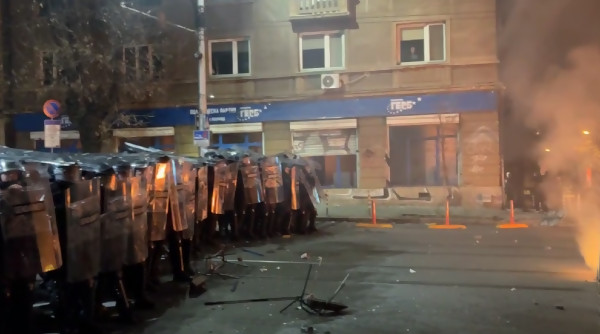 Протестът в София ескалира: Лютив спрей и бомбички край централата на ДПС, запалени контейнери и потрошени полицейски коли