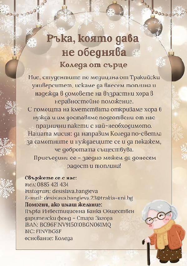 Студенти по медицина от Тракийски университет ще дарят “Коледа от сърце“ на възрастни хора в неравностойно положение