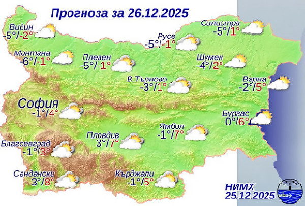Утре - петък, 26 декември, облачността временно ще се разкъсва и намалява. Минималните температури ще бъдат предимно между минус 5° и 0°, в София – ...