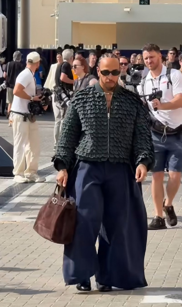 Люис Хамилтън сложи точка на сезон 2025 във Формула 1 с впечатляващо модно присъствие на Гран при на Абу Даби. Пилотът се появи в падока с персонализирана визия на Dior – тъмнозелено бомбър яке с текстура, наподобяваща люспи, комбинирано с ултрашироки, ефирни тъмносини панталони. В ръка – кафява чанта Dior, а цялостната визия носеше самурайско вдъхновение, сякаш готов за последна битка.