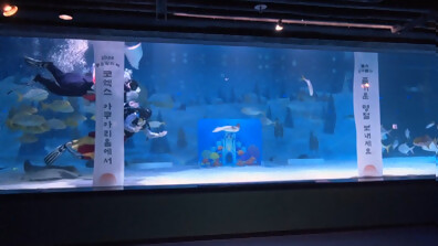 Водолази в традиционни носии с представление в аквариума в Сеул
