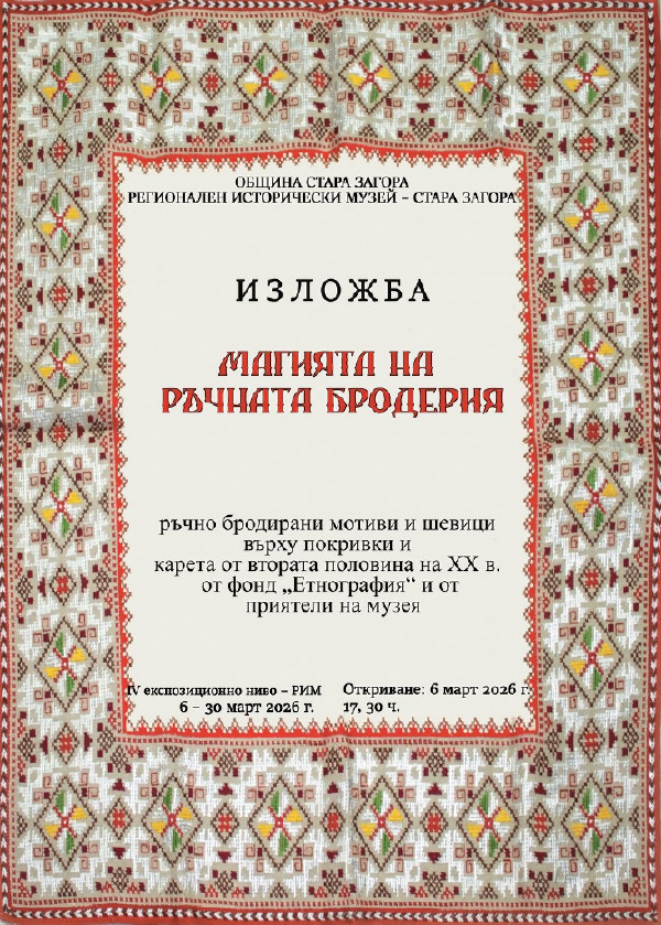 В музея ще бъдат изложени ръчно бродирани мотиви и шевици върху покривки и карета от втората половина на ХХ в., част от фонд „Етнография“ на Регионалния исторически музей и от приятели на музея В навечерието на Международния ден на жената, на 6 март 2026 г. от 17.30 ч., в Регионален исторически музей – Стара Загора […]