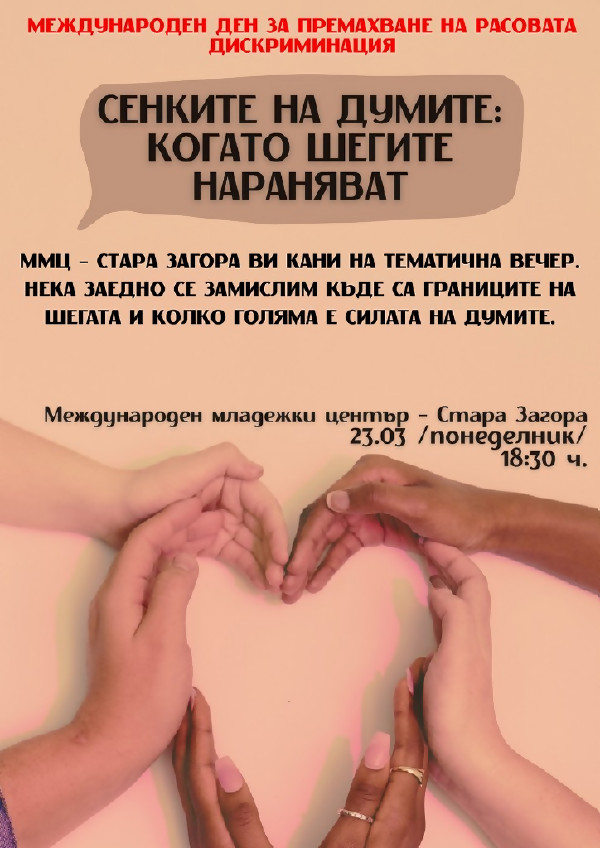 Събитието е по повод Международния ден за премахване на расовата дискриминация В Международния младежки център – Стара Загора (ММЦ) ще се проведе тематична вечер, посветена на силата на думите и границите на шегата, по повод Международния ден за премахване на расовата дискриминация. Събитието „Сенките на думите: когато шегите нараняват“ ще се проведе днес, 23 март (понеделник) […]