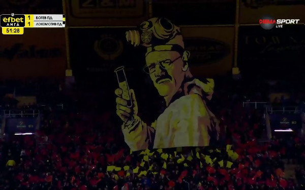 Феновете на Ботев Пд издигнаха много специален транспарант в началото на второто полувреме на мача с Локомотив Пд в мача от 29 кръг на efbet Лига. Любопитна фигура се появи на трибуната зад вратаря Наумов, оприличена от мнозина като героя от сериала „В обувките на Сатаната“ (Breaking Bad). Дали това е злия...
