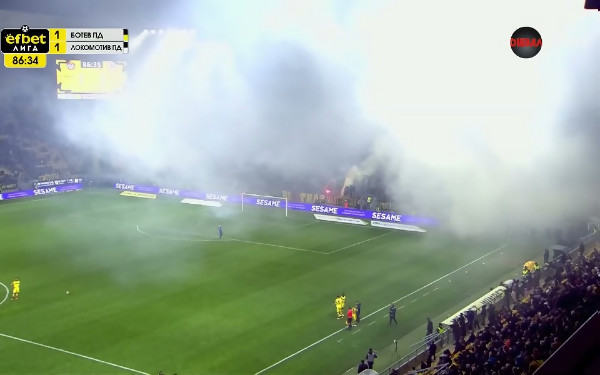 Запалените факли и димки от феновете на Ботев Пд прекъснаха срещата с Локомотив Пд от 29 кръг на efbet Лига за няколко минути в самия край на битката на стадион "Христо Ботев" при резултат 1:1....