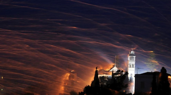 Огнено небе над Хиос на Възкресение: Традиция превърна нощта в светлинен спектакъл (СНИМКИ)