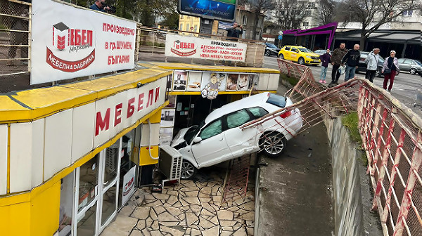 Кола се вряза в магазин на оживено кръстовище в Шумен (СНИМКИ)
