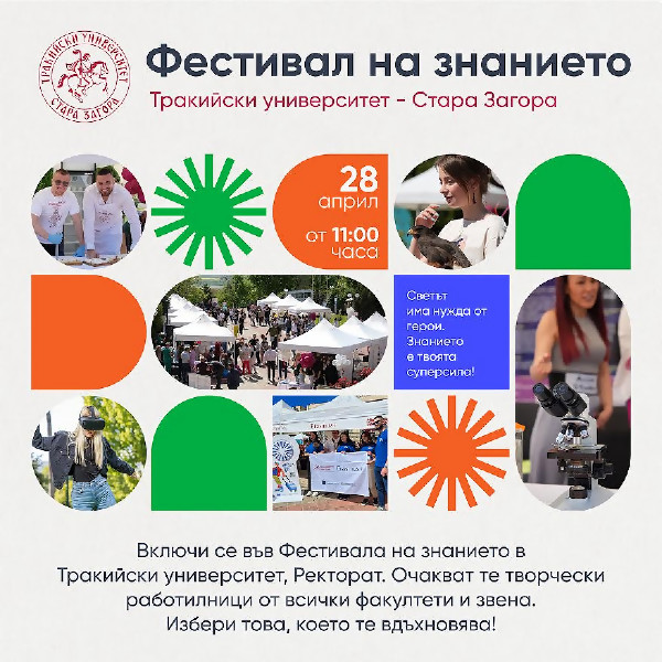 Тракийски университет – Стара Загора ще проведе за пета поредна година пролетното издание на Фестивала на знанието на 28 април от 11:00 часа във вътрешния двор на Ректората (Английски двор) с...