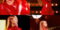 Облечена в ултраобтегнат червен латексов гащеризон и черни кожени ботуши — плюс гладка прическа със страничен път —…
