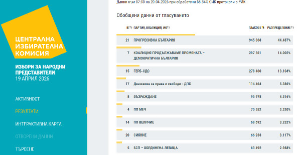 ЦИК при 60,79% обработени протоколи: „Възраждане“ минава прага за парламента