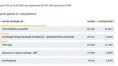 Оспорвана битка между ПП-ДБ и ГЕРБ за второто място при 68,34% обработени резултати