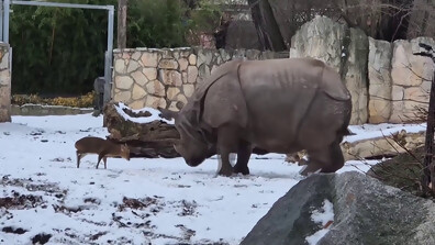 Малък елен се изправи срещу носорог в полски зоопарк (ВИДЕО)