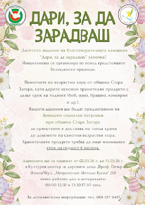 До 13 март старозагорци могат да се включат в благотворителната кампания „Дари, за да зарадваш“
