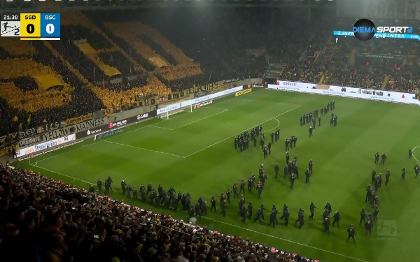 Хаос на терена в Дрезден: фенове с пиротехника започнаха престрелка, а други нахлуха в отговор