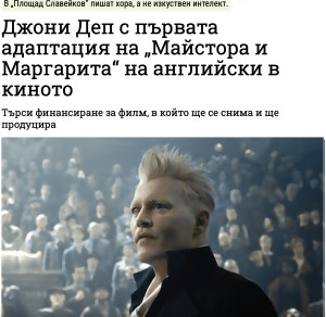 Джони Деп ще играе във филмова интерпретация на “Майстора и Маргаритата” на английски, съобщават от сайта “Площад Славейков”. Пожелавам успех на творците в трудното начинание да преведат и поднесат за консумация разбираемо за западняците цялата иносказателност на загадъчната съветска душа, закодирана в произведението на Булгаков, принуден да използва “езопов език”. Четяхме го като млади ... Продължение