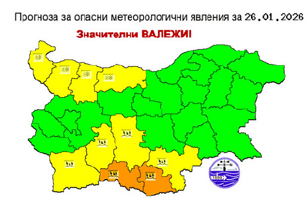 Жълт и оранжев код за значителни валежи от дъжд, сняг, поледици и силен вятър