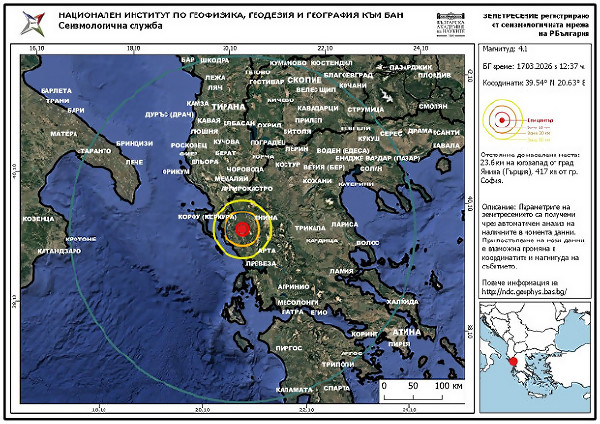 Земетресение с магнитуд от 4,2 по скалата на Рихтер е било регистрирано в обедните часове днес в района на град Янина, Северозападна Гърция, съобщи гръцката държавна телевизия ЕРТ. Епицентърът на труса е бил на 7,1 км северозападно от селището Тирия, а дълбочината на огнището се оценяв