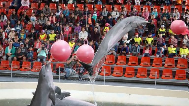 Делфинското шоу е придружено с анимация и акробатики