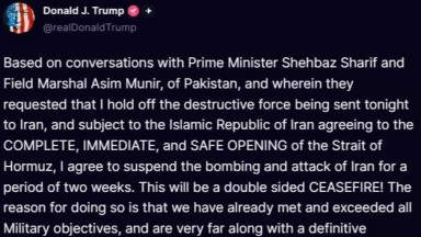 Прекратяването на огъня е за 2 седмици, в Исламабад предстоят преговори по план на Техеран от 10 точки