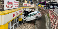 Зрелищно меле в Шумен: "Ауди" падна върху мебелен магазин след сблъсък, има ранени